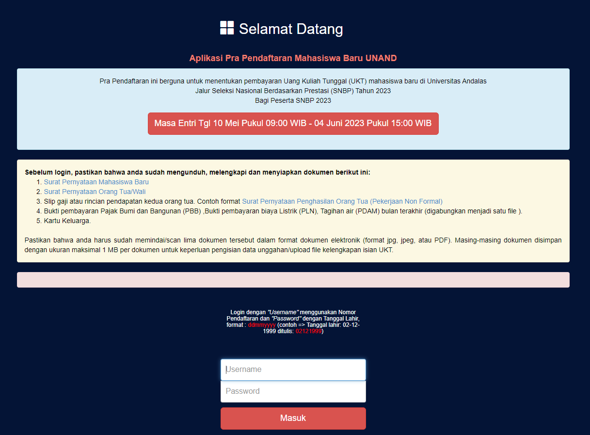 Aplikasi Pra Pendaftaran ini berguna untuk menentukan pembayaran Uang Kuliah Tunggal (UKT) mahasiswa baru di Universitas Andalas untuk jalur :