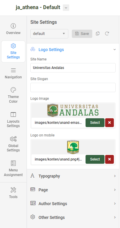 3. Klik menu Site Settings, kemudian upload logo pada kolom Logo Image, lalu klik Save.